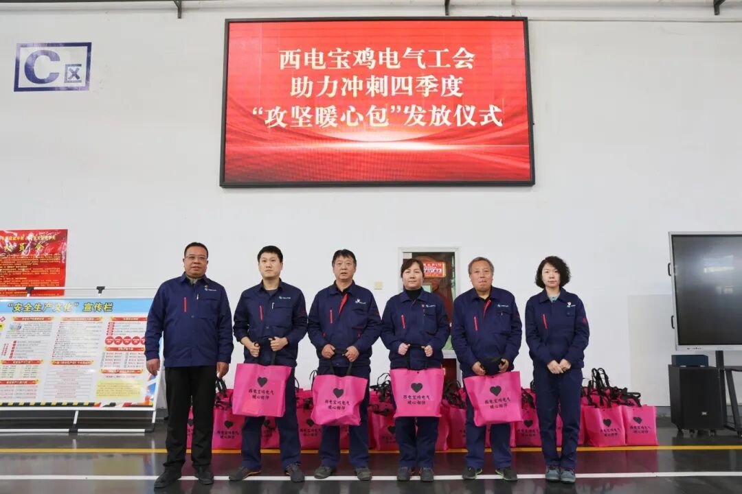 11月11日,在四季度沖刺年度目標的關鍵節點,西電寶雞電氣“攻堅暖心包”發放儀式在一號廠房內溫情啟幕。寶光集團(西電寶雞電氣)黨委副書記、紀委書記、工會主席姚書勤,副總經理張巧玲為職工送上滿載關懷的暖心禮包,以實際行動為攻堅一線注入溫暖力量。
